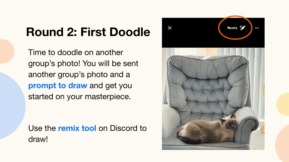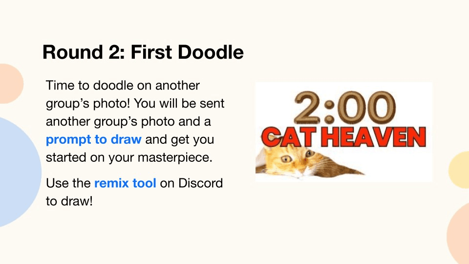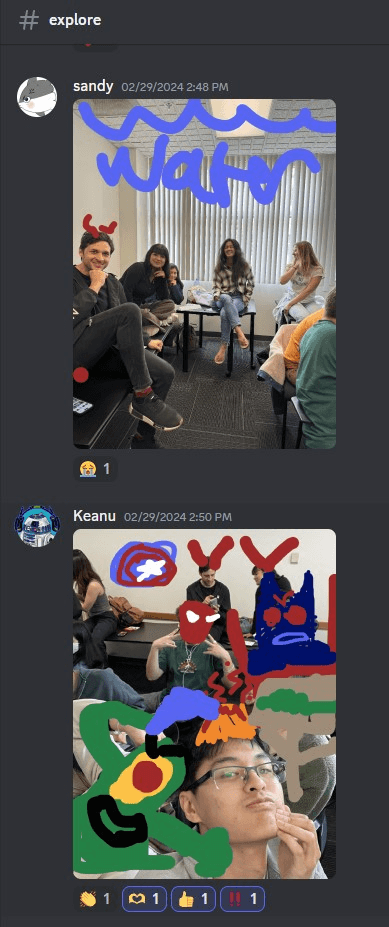 We then used the submitted photos to prompt the next team in each group. Participants were asked to draw on the photos with the given prompt: 'Draw people as superheroes, complete with capes, masks, and unique superpowers'. We utilized Discord's remix feature, which enables users to draw directly on pictures sent via Discord.