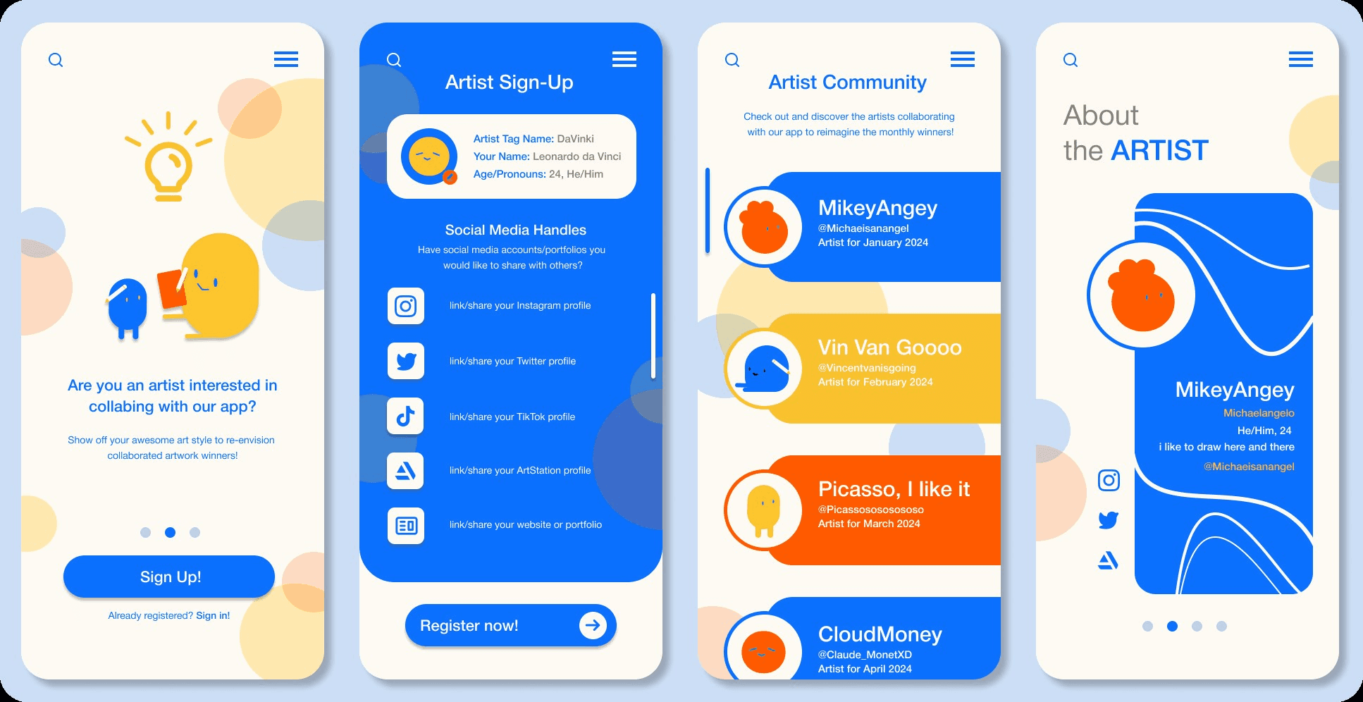 Our next phase with DaVinki focuses on refining ideas from our prototyping session and designing UI screens for the verified artist feature. This addition enriches the app, fostering connections among passionate artists while compensating them for their contributions. It demonstrates our commitment to supporting local artists, beyond the app's core function.