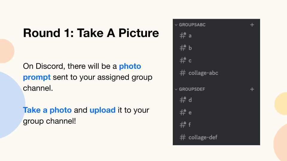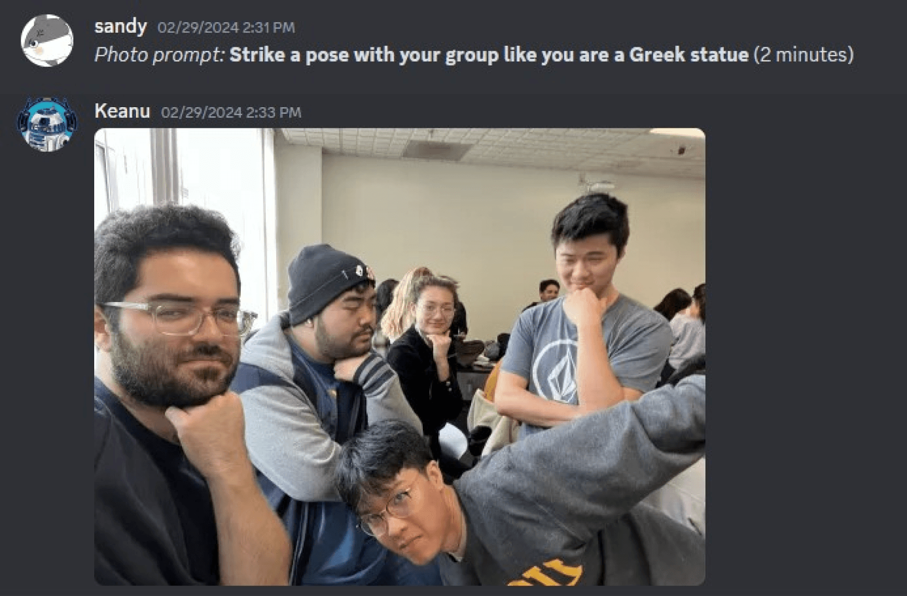 Participants were then prompted with a notification indicating it was time to take a photo to commence their creative journey! We sent the photo prompt to each channel on our Discord server: 'Strike a pose with your group as if you were Greek statues'. Once each team had taken their photos, the team representative submitted them to their respective team channel.