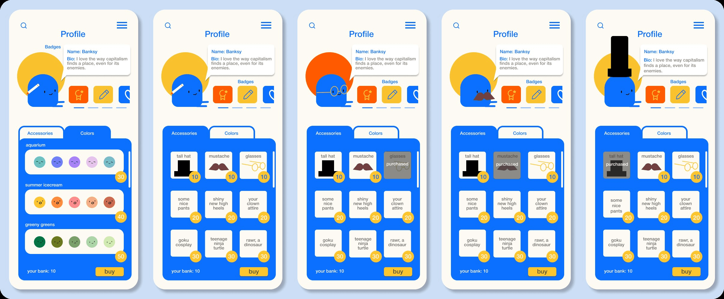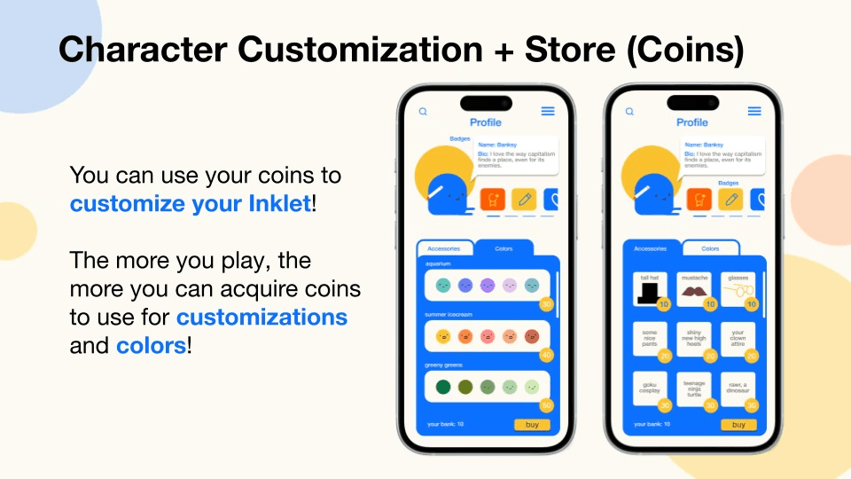 After each drawing round, users receive a certain amount of coins as a reward for completing the activity. We've integrated a store into the prototype, allowing users to purchase customizations for their inklet (character avatar) and unlock additional color palettes using the earned coins. This incentivizes users to return to the app regularly.